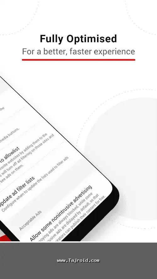 برنامه از لیست های فیلتر به روز و قابل تنظیم پشتیبانی می کند. شما می توانید میزان فیلتراسیون را تنظیم کنید (مثلاً اجازه نمایش تبلیغات غیرمزاحم در سایت های موردعلاقه) یا حتی سایت های خاصی را به لیست سفید (Whitelist) اضافه کنید تا تبلیغات در آن ها نمایش داده شود و از سایت مورد نظر حمایت کنید. این انعطاف پذیری، کنترل خوبی در اختیار کاربر می گذارد.