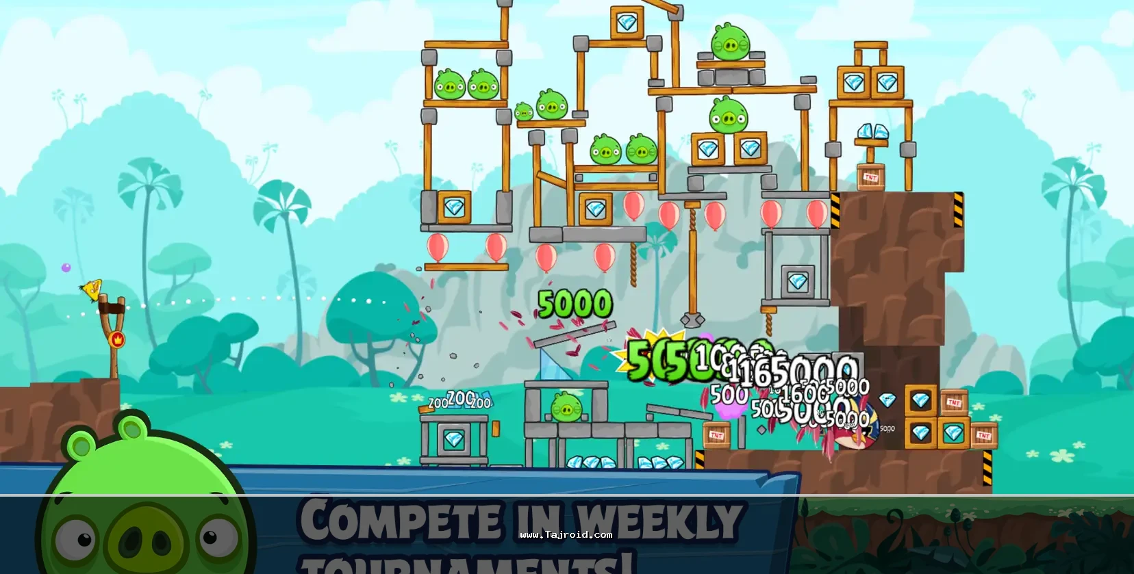 در بازی Angry Birds Friends برای اندروید همان گیم پلی کلاسیک و دوست داشتنی قلاب سنگ حفظ شده، اما این بار همه چیز رنگ و بوی رقابت به خود گرفته است. شما می توانید در تورنمنت های هفتگی شرکت کنید، امتیاز بگیرید و با شکست دادن خوک های حریص، جایگاه خود را در جدول رده بندی بالا ببرید. هر هفته مراحل جدیدی اضافه می شود که همگی زمان دار هستند و همین موضوع باعث می شود بازی همیشه تازه و چالش برانگیز باقی بماند.
