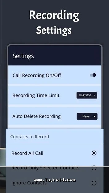 در نسخه پرمیوم Automatic Call Recorder ACR تمامی محدودیت ها حذف شده و شما به همه امکانات حرفه ای برنامه دسترسی کامل خواهید داشت. این برنامه به محض شروع تماس، فرآیند ضبط را بدون نیاز به هیچ اقدام دستی آغاز کرده و پس از پایان مکالمه، فایل صوتی را با کیفیت بالا ذخیره می کند. کاربران می توانند مخاطبین خاص را از ضبط خودکار مستثنا کنند، برای هر تماس ضبط شده یادداشت اختصاصی بنویسند و مکالمات مهم را به سادگی مدیریت نمایند. وجود پلیر داخلی قدرتمند باعث می شود بدون نصب هیچ نرم افزار اضافی، فایل های صوتی تماس ها را پخش کنید و در صورت نیاز، آن ها را به راحتی با دیگران به اشتراک بگذارید.