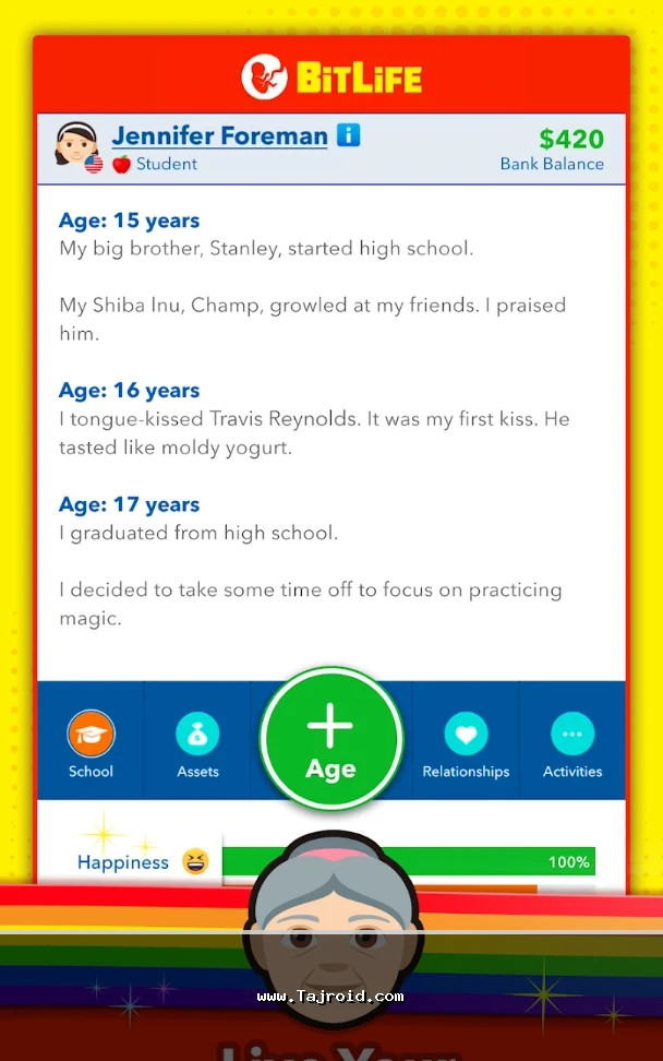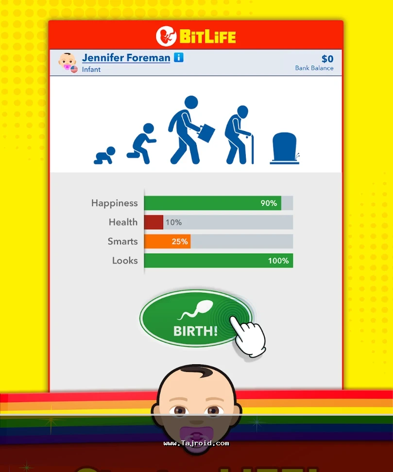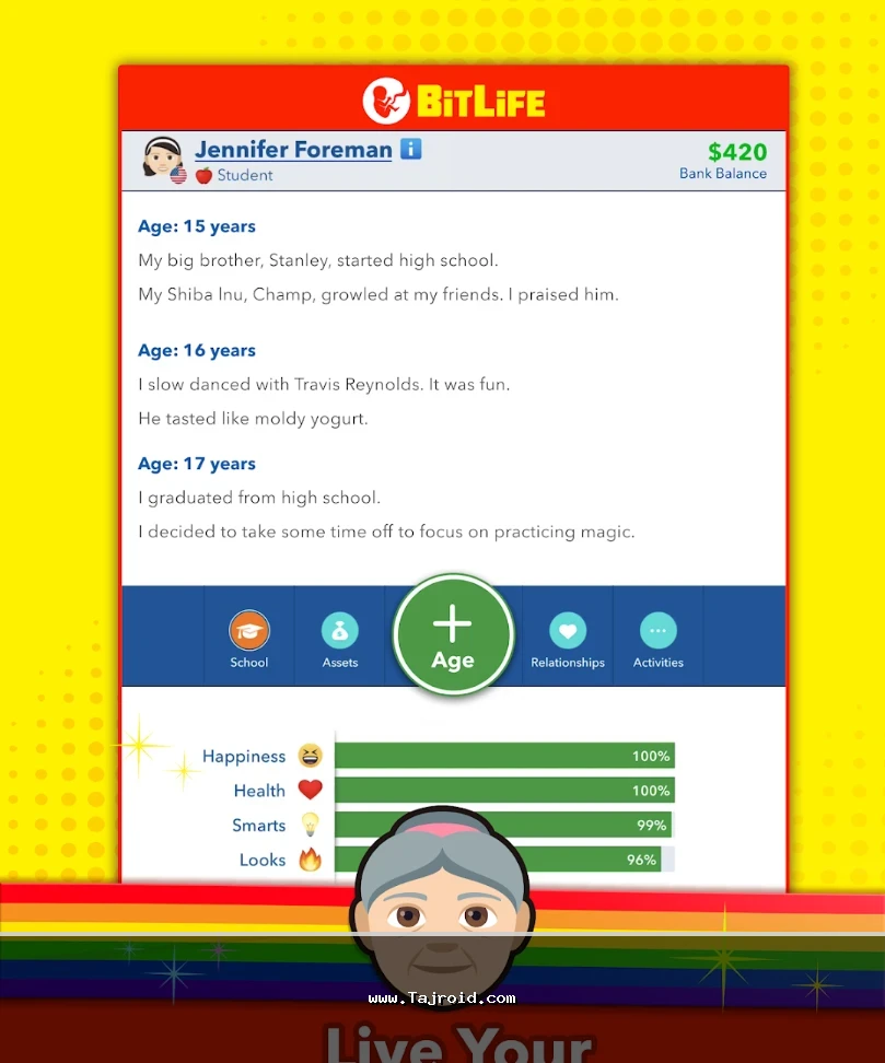 در BitLife اندروید همه چیز با تولد شما در یک کشور تصادفی آغاز می شود؛ با پدر و مادری که نقش مهمی در سال های ابتدایی زندگی تان دارند. در کودکی تعاملات محدود است، اما با افزایش سن، گزینه ها و انتخاب ها به صورت گسترده در اختیار شما قرار می گیرند. می توانید به مدرسه بروید، درس بخوانید یا از همان ابتدا مسیر متفاوتی را انتخاب کنید. در نوجوانی و بزرگسالی امکان تحصیل دانشگاهی، انتخاب شغل، ازدواج، داشتن فرزند، خرید خانه، سفر، ورزش، مدیتیشن و حتی ارتکاب جرم فراهم می شود. نکته جذاب بازی اینجاست که هیچ انتخابی بی تأثیر نیست و هر تصمیم، پیامدهای کوتاه مدت و بلندمدت خاص خود را دارد.