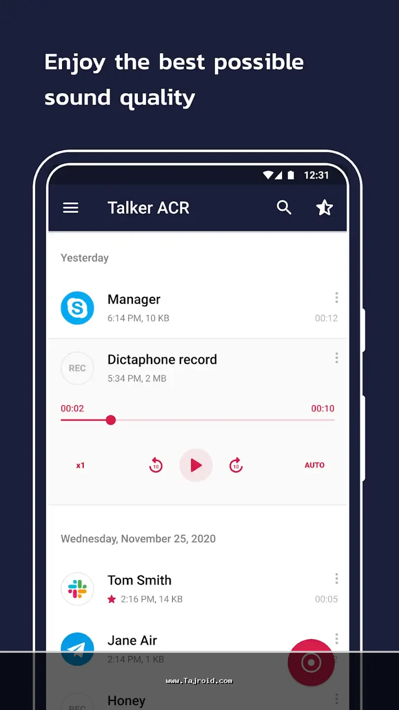 یکی از مهم ترین نقاط قوت برنامه ضبط تماس Talker ACR، کیفیت فوق العاده صدای ضبط شده است. تماس ها با وضوح بالا ذخیره می شوند و حتی جزئیات صدا نیز به خوبی قابل شنیدن هستند. برخلاف بسیاری از برنامه های مشابه، این اپلیکیشن تماس ها را به صورت هوشمند دسته بندی می کند تا کاربران بتوانند در کوتاه ترین زمان ممکن به فایل موردنظر خود دسترسی داشته باشند. همچنین تاریخچه تماس ها به طور کامل ثبت می شود و مدیریت فایل ها بسیار ساده و سریع انجام می گیرد.