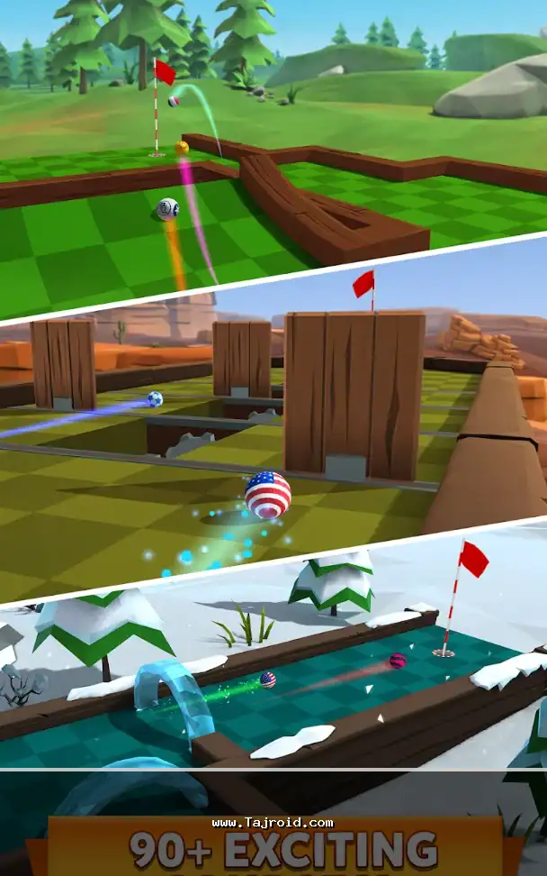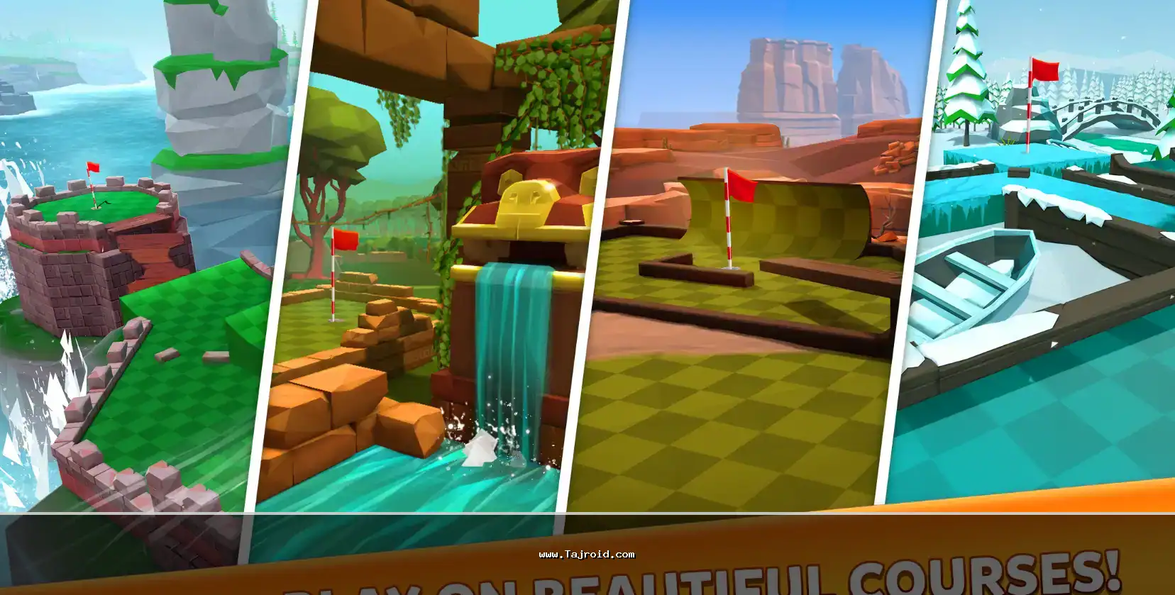 گرافیک بازی رنگی، شاد و بسیار روان است. زمین های گلف در محیط های متنوع و خلاقانه ای مانند چمن زار، برف، بیابان یا حتی محیط های فانتزی طراحی شده اند. این تنوع بصری نه تنها خسته کننده نیست، بلکه هر مسابقه را به تجربه ای تازه تبدیل می کند. عملکرد بازی نیز به گونه ای بهینه سازی شده که روی طیف گسترده ای از دستگاه های اندرویدی به روانی اجرا شود.
