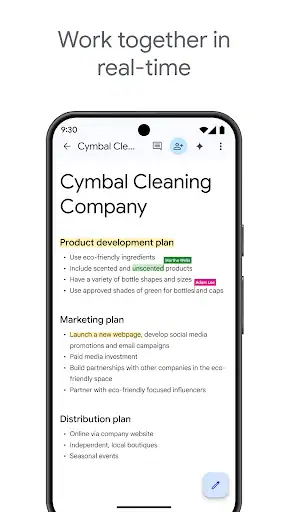 Google Docs با اتصال مستقیم به سرویس ابری Google Drive به شما این امکان را می دهد تا تمام فایل های متنی خود را در یک مکان امن نگهداری کنید. یکی از قابلیت های برجسته این اپلیکیشن، ویرایش گروهی (Collaborative Editing) است؛ یعنی چند کاربر می توانند هم زمان روی یک سند کار کنند، نظرات خود را اضافه کنند و تغییرات یکدیگر را در لحظه ببینند. علاوه بر این، نسخه های مختلف سند شما به صورت خودکار ذخیره می شوند تا هیچ اطلاعاتی از بین نرود.