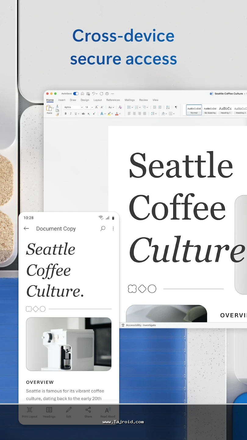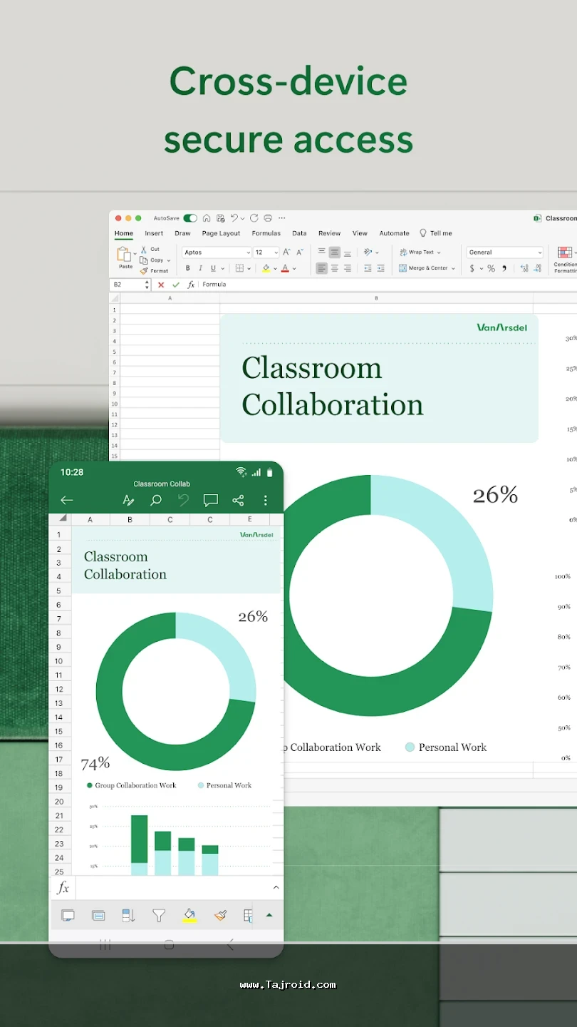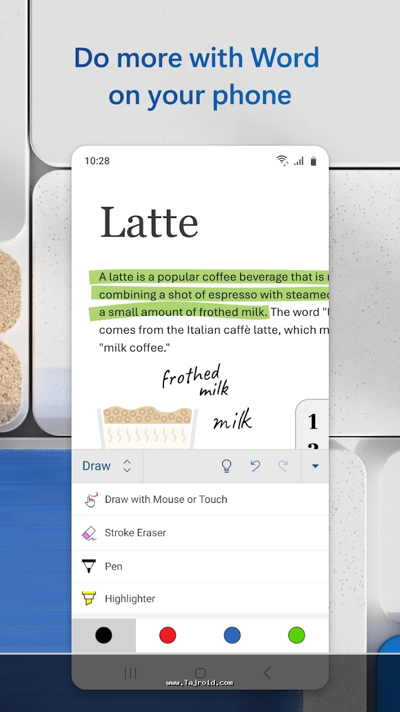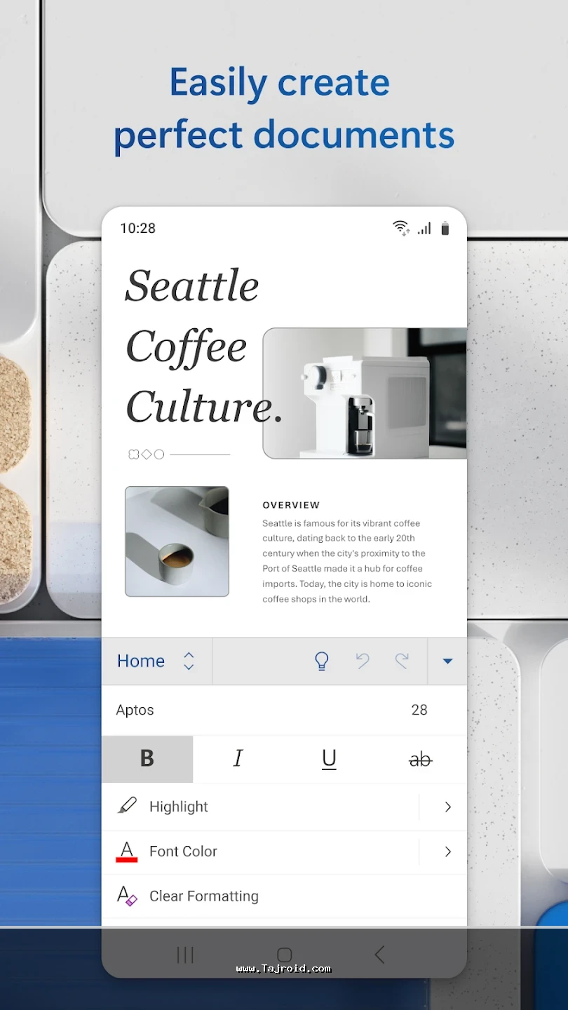 برنامه آفیس اندروید مایکروسافت با رابط کاربری ساده، روان و کاملاً بهینه شده برای صفحه نمایش موبایل و تبلت، تجربه ای سریع و بدون دردسر را در اختیار کاربران قرار می دهد. این پکیج برای دانشجویان، دانش آموزان، کارمندان، مدیران و تمامی افرادی که به صورت روزانه با فایل های آفیس سروکار دارند، یک انتخاب ایده آل محسوب می شود. پشتیبانی از فرمت های مختلف آفیس، هماهنگی عالی بین ابزارها و عملکرد پایدار، باعث شده آفیس مایکروسافت یکی از بهترین برنامه های آفیس اندروید باشد. شما می توانید این پکیج قدرتمند آفیس برای اندروید را به صورت تست شده و مطمئن از سایت تاجروید دانلود کرده و از امکانات کامل آن روی دستگاه اندرویدی خود بهره مند شوید.