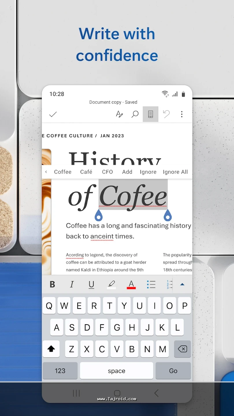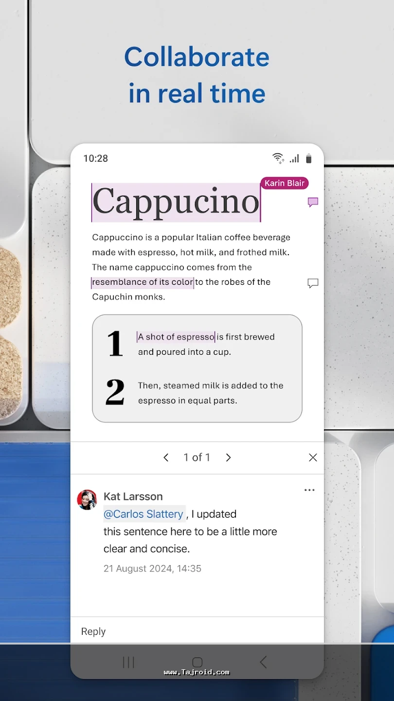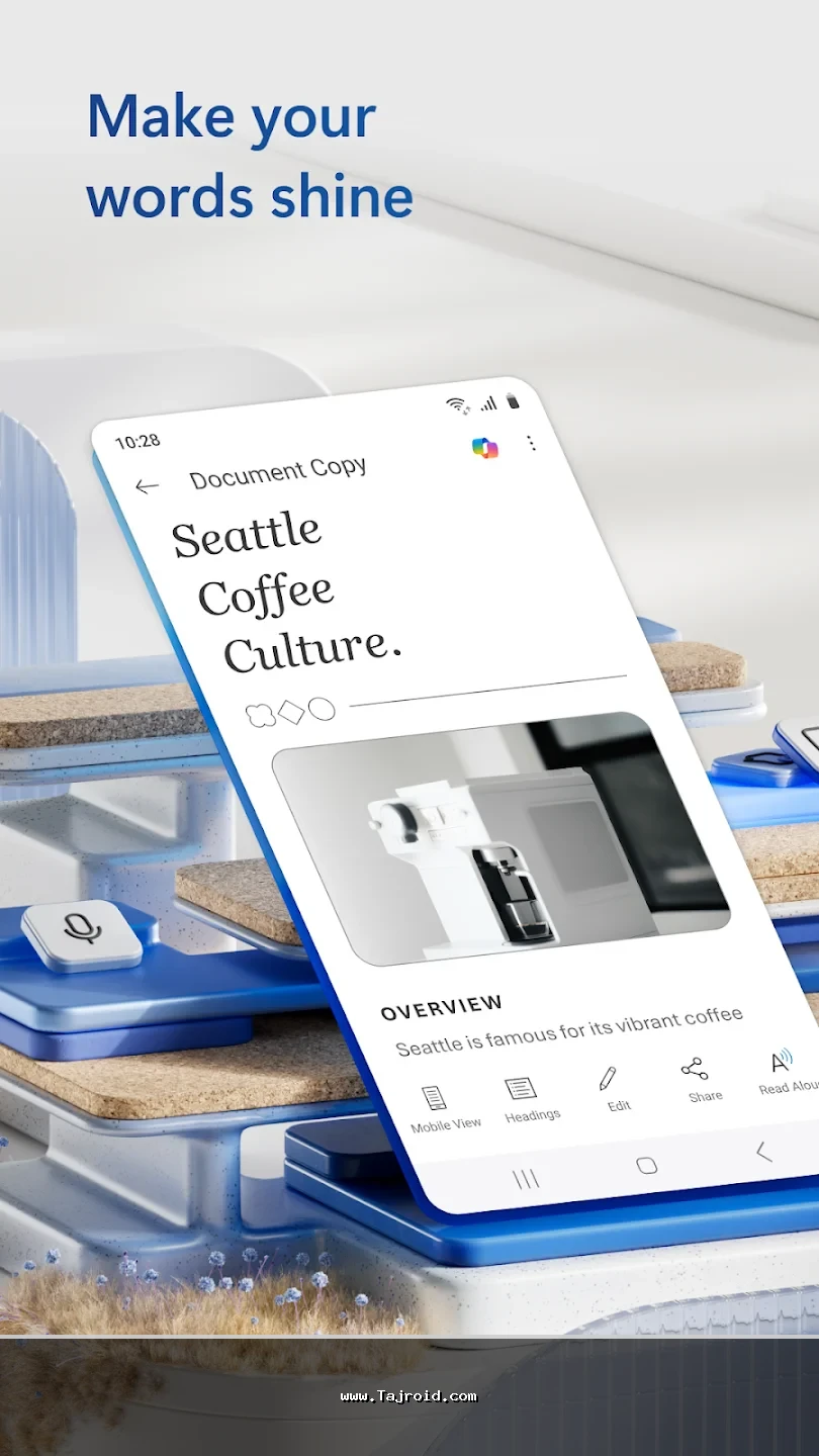 برنامه آفیس اندروید مایکروسافت با رابط کاربری ساده، روان و کاملاً بهینه شده برای صفحه نمایش موبایل و تبلت، تجربه ای سریع و بدون دردسر را در اختیار کاربران قرار می دهد. این پکیج برای دانشجویان، دانش آموزان، کارمندان، مدیران و تمامی افرادی که به صورت روزانه با فایل های آفیس سروکار دارند، یک انتخاب ایده آل محسوب می شود. پشتیبانی از فرمت های مختلف آفیس، هماهنگی عالی بین ابزارها و عملکرد پایدار، باعث شده آفیس مایکروسافت یکی از بهترین برنامه های آفیس اندروید باشد. شما می توانید این پکیج قدرتمند آفیس برای اندروید را به صورت تست شده و مطمئن از سایت تاجروید دانلود کرده و از امکانات کامل آن روی دستگاه اندرویدی خود بهره مند شوید.