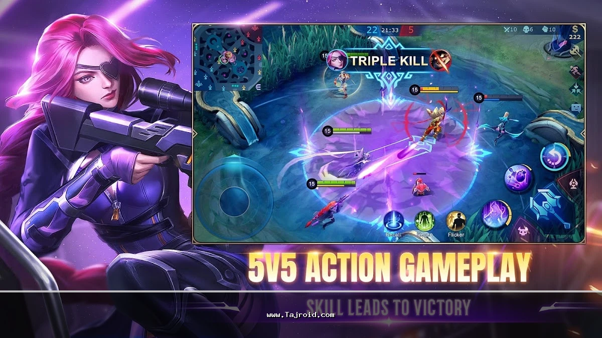 موبایل لجند بنگ بنگ برای اندروید از نظر طراحی نقشه، سیستم مبارزات، مهارت ها و کنترل ها، کاملاً بهینه شده برای صفحه لمسی موبایل است و با یک لمس ساده می توانید مهارت ها را فعال کرده و جریان نبرد را تغییر دهید. گرافیک چشم نواز، افکت های جذاب، آپدیت های منظم و رویدادهای متنوع باعث شده این بازی همیشه تازه و پرهیجان باقی بماند. توجه داشته باشید که Mobile Legends یک بازی کاملاً آنلاین است و برای اجرای آن نیاز به اتصال اینترنت دارید. اگر از علاقه مندان بازی های MOBA و نقش آفرینی آنلاین اندروید هستید، بدون شک موبایل لجند یکی از بهترین انتخاب ها برای شما خواهد بود که می توانید جدیدترین نسخه رسمی آن را از سایت تاجروید دانلود و نصب کنید.