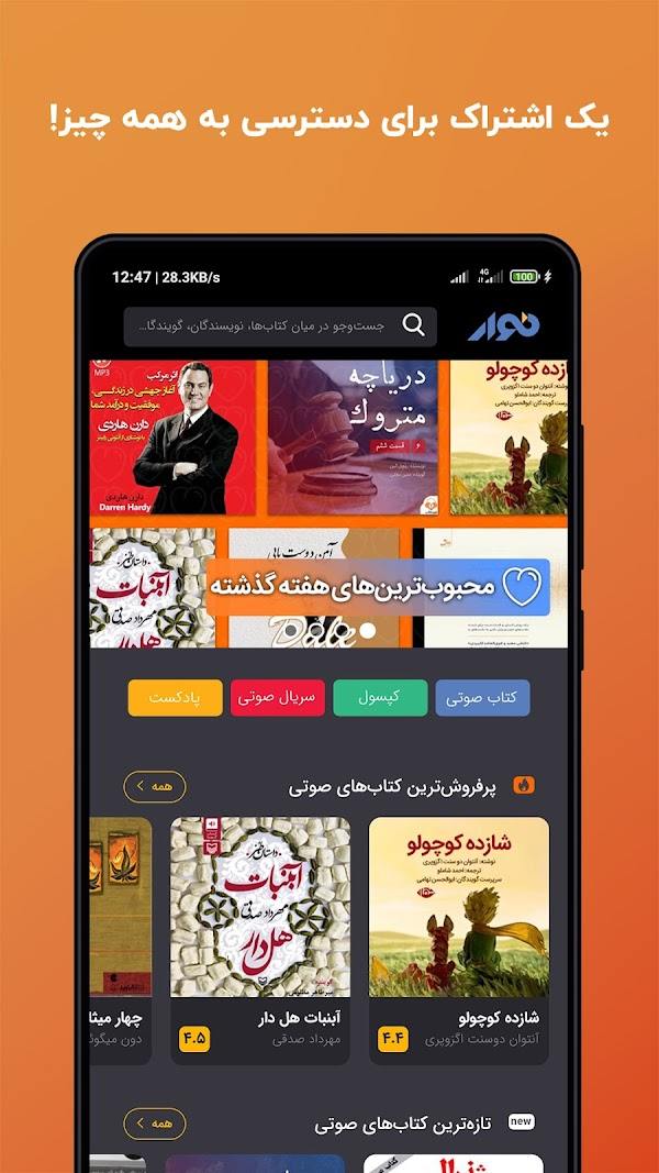 دانلود نوار تجربه ای کاملاً متفاوت و لذت بخش از شنیدن کتاب های صوتی را برای کاربران فراهم می کند. در دنیای پرمشغله امروز، بسیاری از افراد فرصت یا انرژی کافی برای مطالعه کتاب های چاپی ندارند. اینجاست که کتاب های صوتی وارد میدان می شوند و جریان مطالعه را ساده تر، دلنشین تر و در دسترس تر می کنند. اپلیکیشن Navaar با هدف ارائه محتوای صوتی قانونی، باکیفیت و حرفه ای طراحی شده و به یکی از بزرگ ترین پلتفرم های کتاب صوتی فارسی تبدیل شده است. نوار با همکاری ناشران معتبر و گویندگان حرفه ای، بستری ایجاد کرده که در آن می توان به جدیدترین رمان ها، پادکست ها، خلاصه کتاب ها و مجموعه های صوتی دسترسی داشت.