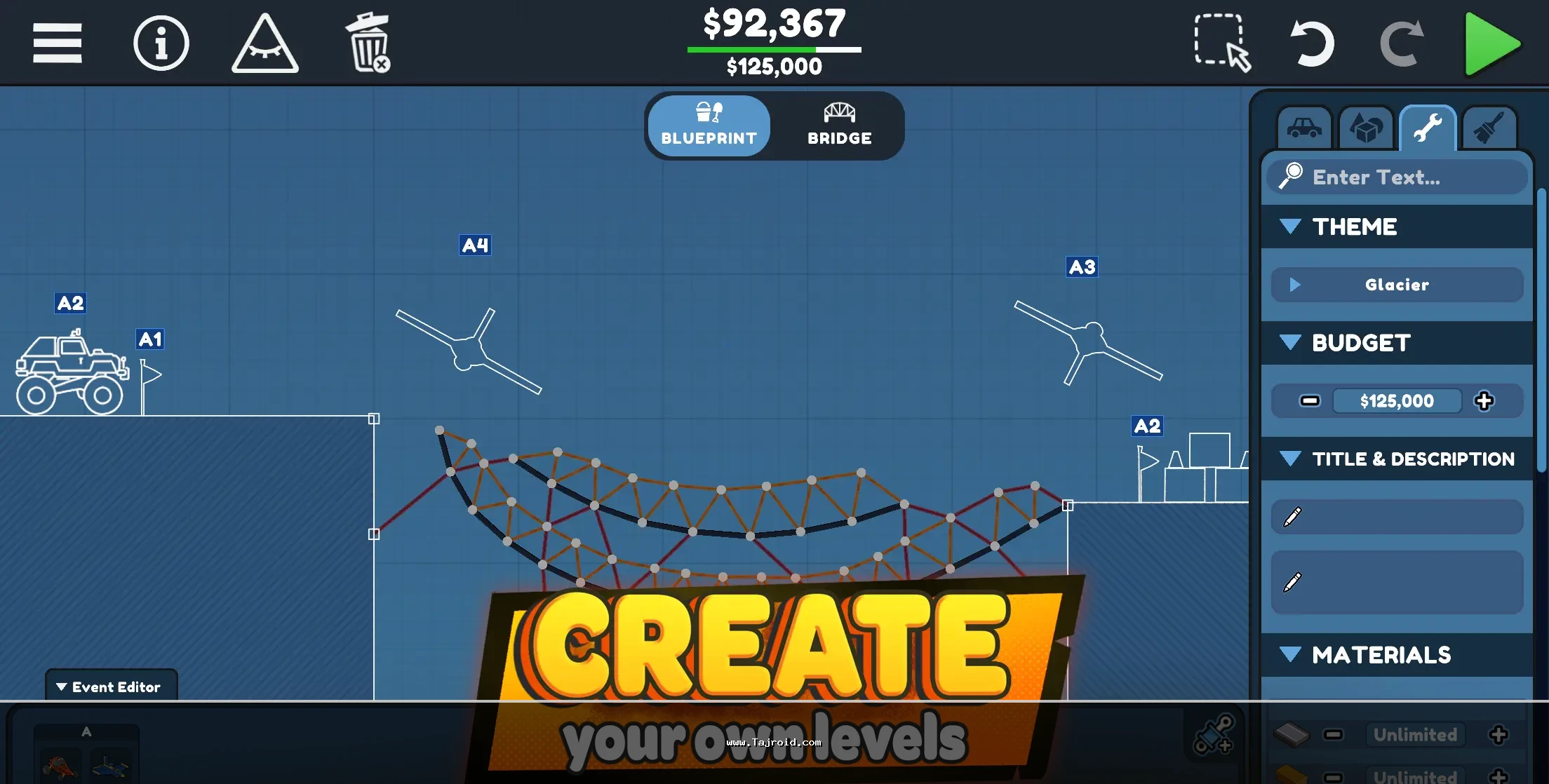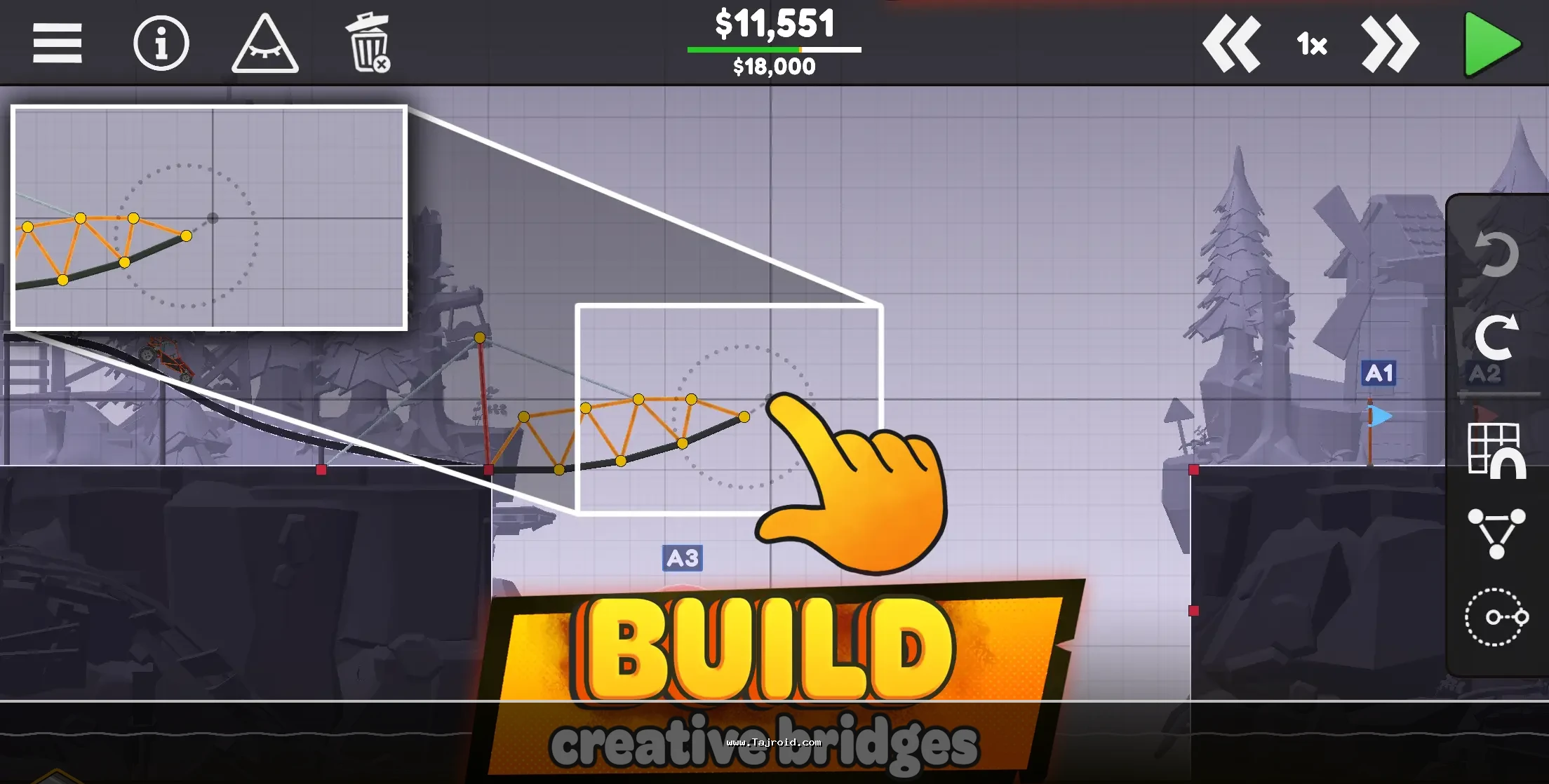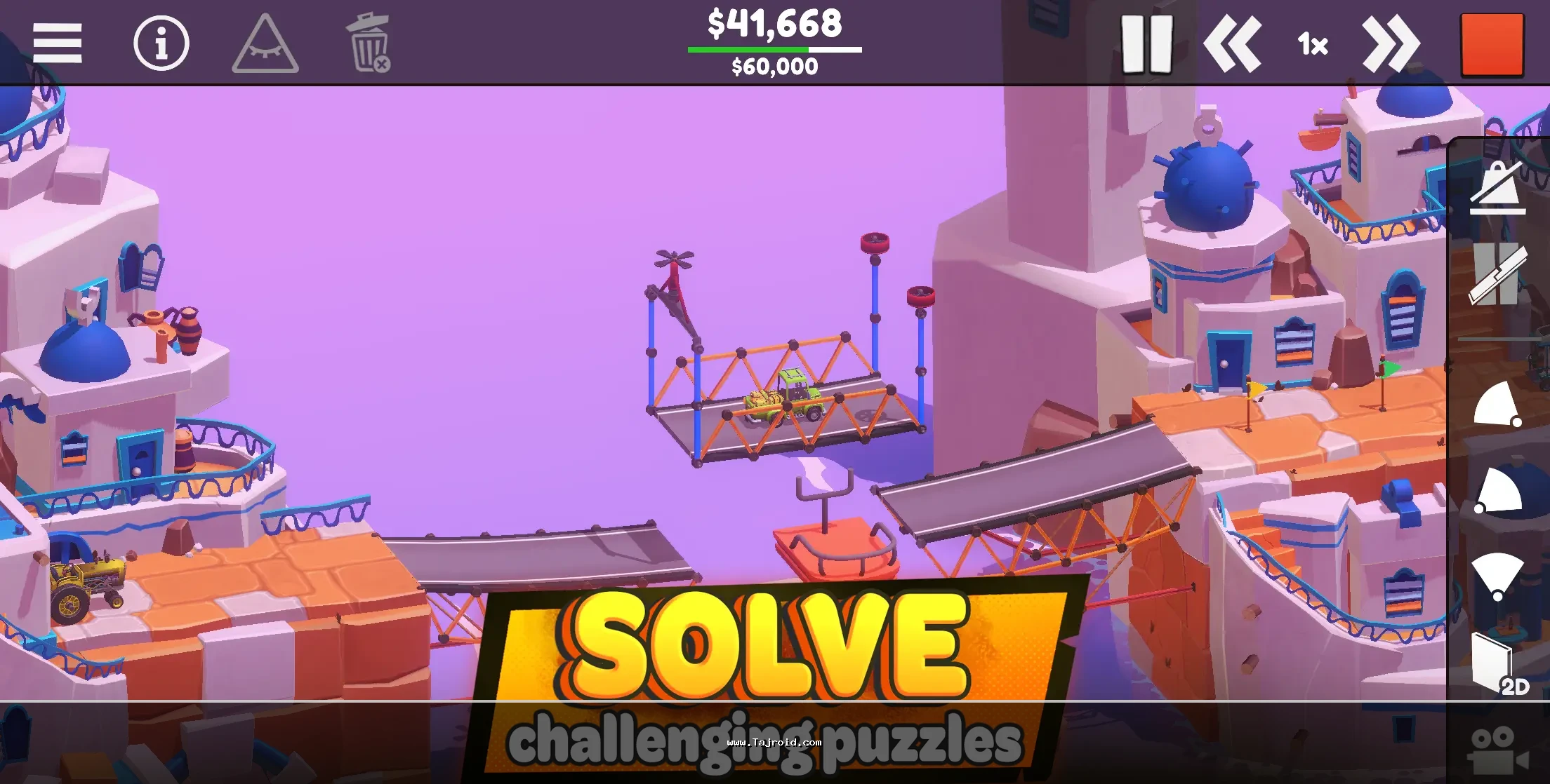 در Poly Bridge 3 اندروید شما در نقش یک مهندس خلاق ظاهر می شوید که باید با استفاده از ابزارها و متریال های مختلف، پل هایی مقاوم و کم هزینه طراحی کند تا وسایل نقلیه بتوانند با موفقیت از موانع عبور کنند. هر مرحله چالش منحصربه فردی دارد؛ از دره ها و شکاف های عمیق گرفته تا شرایط خاص وزن، زاویه و حرکت خودروها. بازی روایت کلاسیک داستانی ندارد، اما با پیشرفت در مراحل، نوعی داستان غیرمستقیم از آزمون و خطا، یادگیری تدریجی و تسلط بر اصول مهندسی شکل می گیرد که حس پیشرفت واقعی را منتقل می کند.