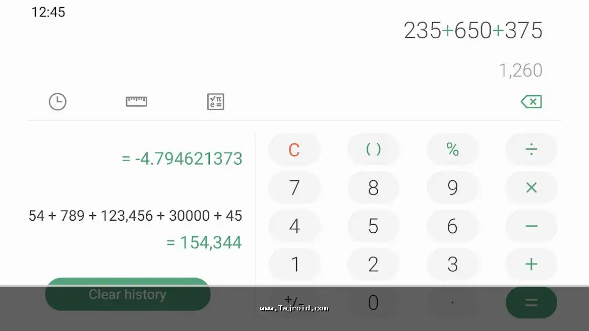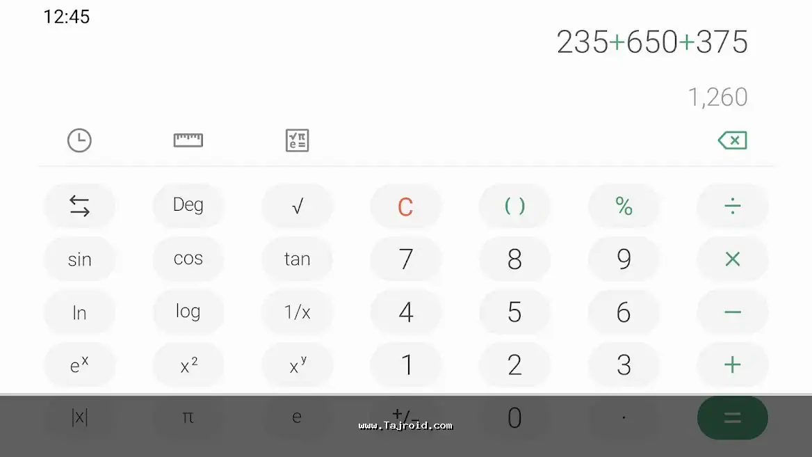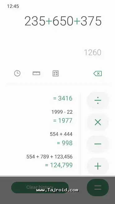 ماشین حساب سامسونگ در حالت پیش فرض، یک محیط تمیز و شهودی دارد که انجام محاسبات پایه (جمع، تفریق، ضرب، تقسیم) را بسیار آسان می کند. اما یکی از جالب ترین قابلیت های آن، محاسبه زنده (Live Calculation) است. شما نیازی به فشار دادن دکمه مساوی (=) ندارید؛ به محض وارد کردن اعداد و عملگرها، نتیجه به طور زنده در بالای صفحه نمایش داده می شود. این ویژگی سرعت کار را به شکل چشمگیری افزایش می دهد.