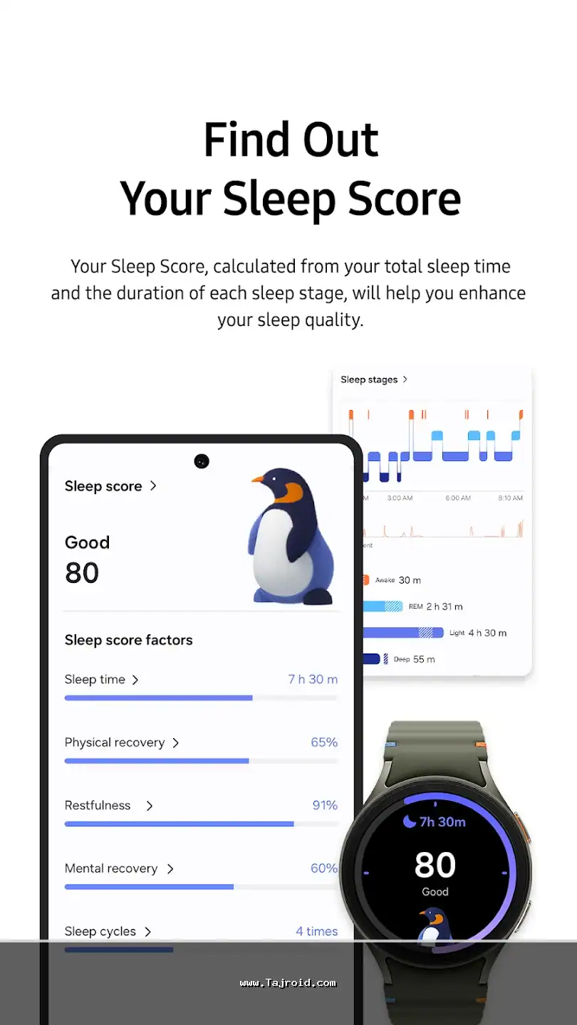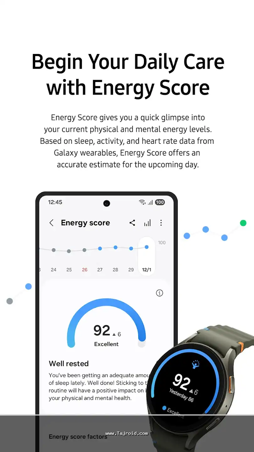 برنامه قابلیت مانیتورینگ سلامت پیشرفته ای نیز دارد. اگر از دستگاه های پوشیدنی سامسونگ مانند Galaxy Watch استفاده کنید، می تواند ضربان قلب، سطح اکسیژن خون (SpO2)، الگوهای خواب (شامل مراحل خواب سبک، عمیق و REM)، سطح استرس و حتی نوار قلب (ECG) را اندازه گیری و ثبت کند. این داده ها در قالب نمودارها و گزارش های قابل فهم ارائه می شوند.