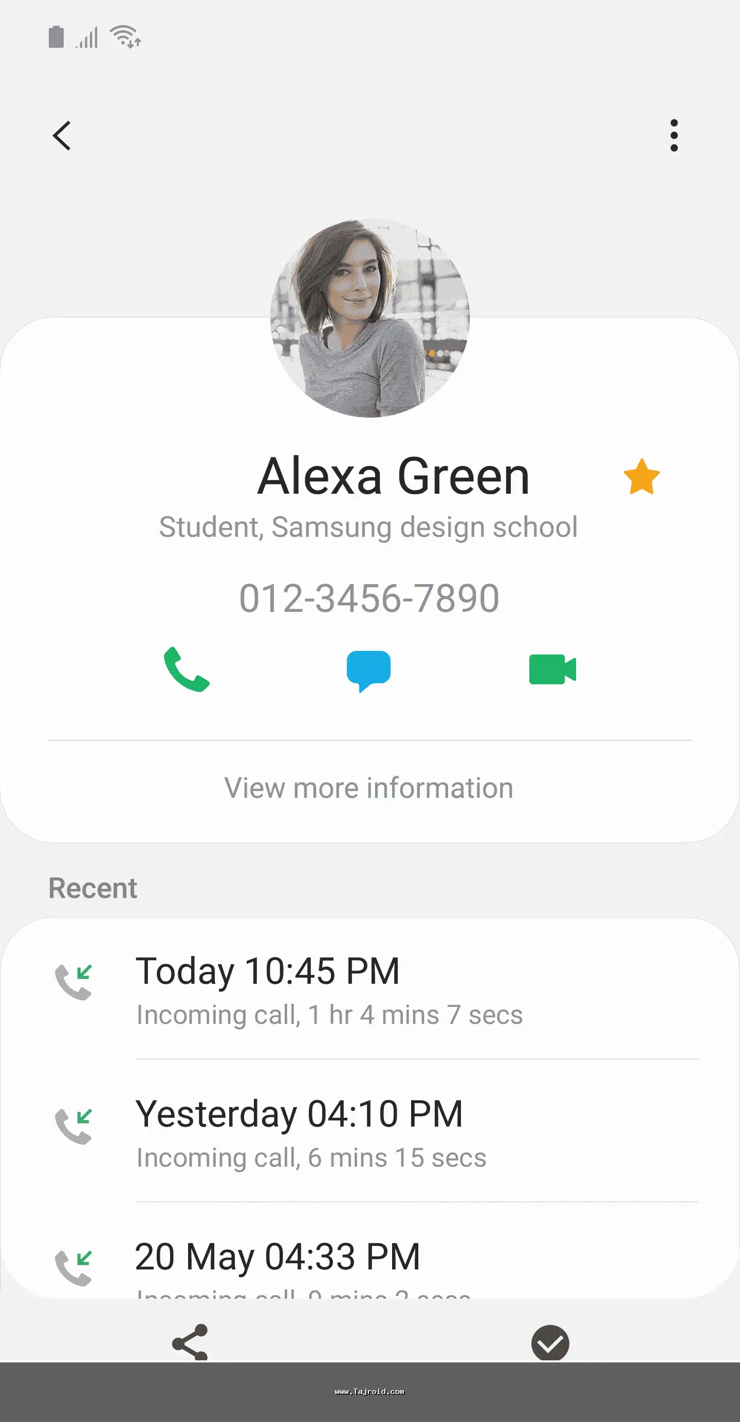 سامسونگ فون یک رابط کاربری تمیز و بسیار خوانا دارد. صفحه شماره گیر بزرگ و واضح است. دفترچه تلفن (Contacts) و تاریخچه تماس (Call Log) به طور یکپارچه در تب های بالای برنامه قرار دارند و جابه جایی بین آنها سریع و آسان است. تاریخچه تماس به وضوح نوع تماس (ورودی، خروجی، از دست رفته)، تاریخ و زمان و در صورت موجود بودن، شناسه تماس گیر (Caller ID) را نشان می دهد.