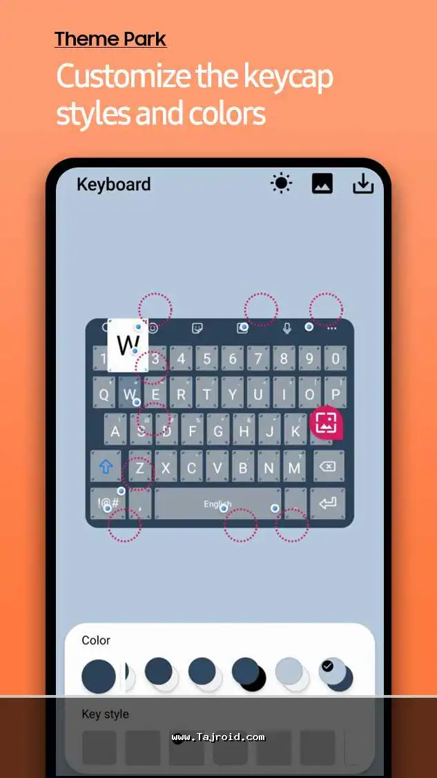یکی از بخش های جذاب، شخصی سازی تخصصی صفحه کلید سامسونگ (Samsung Keyboard) است. می توانید برای صفحه کلید خود تم جداگانه ای با رنگ های متفاوت بسازید، رنگ دکمه ها، حروف و حتی زمینه را به طور مجزا تنظیم کنید تا همخوانی کامل با تم اصلی یا سلیقه شما داشته باشد.