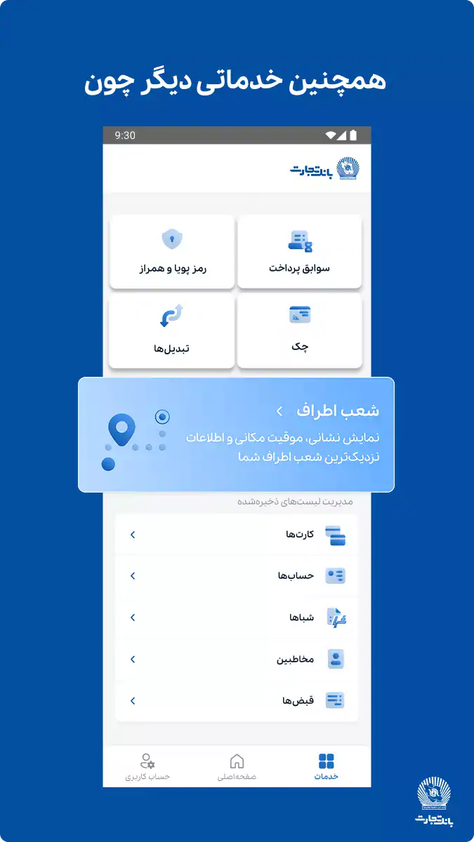 قابلیت های کاربردی دیگری مانند مدیریت چک و صدور چک دیجیتال، پرداخت اقساط تسهیلات، درخواست دسته چک، افتتاح سپرده آنلاین و مشاهده گردش حساب در Tejarat Bank فراهم شده است. این برنامه هر روز توسط میلیون ها نفر استفاده می شود و تیم بانک تجارت مدام در حال بهبود و اضافه کردن امکانات جدید است.