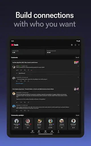یکی از ویژگی های کلیدی این اپلیکیشن، پاسخ مستقیم به نظرات کاربران است. بدون نیاز به مرورگر، می توانید به تمام کامنت ها جواب دهید و تعامل خود با مخاطبان را افزایش دهید. همچنین می توانید ویدیوهای جدید را آپلود کنید، تصویر بندانگشتی اختصاصی بسازید و توضیحات یا برچسب ها را به راحتی تغییر دهید. دانلود YouTube Studio اندروید به شما این امکان را می دهد تا مدیریت کانال خود را به سطح حرفه ای ارتقا دهید.
