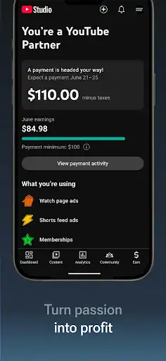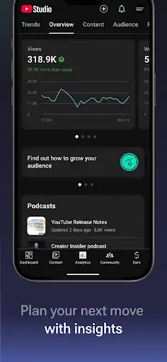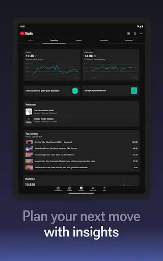 YouTube Studio ابزار کاملی برای بررسی عملکرد کانال شماست. بخش Analytics این اپلیکیشن، آمار لحظه ای و دقیق از بازدید ویدیوها، میزان تعامل کاربران و محبوب ترین محتواها را ارائه می دهد. با این اطلاعات می توانید برنامه ریزی حرفه ای برای تولید محتوا انجام دهید و رشد کانال خود را سریع تر کنید. هرچه بیشتر از این برنامه استفاده کنید، تحلیل های دقیق تر و پیشنهادات بهتری دریافت خواهید کرد.